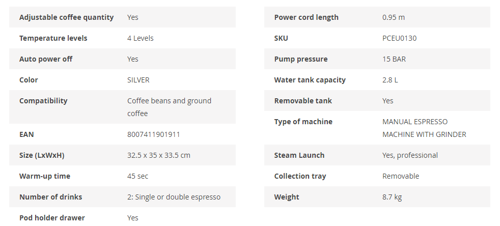 Polti Coffea is a coffee machine with bean grinder that combines elegance and performance to give you a coffee that is always fresh and fragrant, from the aroma of the bean directly to the cup. The touch controls enhance this sensory experience: the integrated coffee grinder that allows you to customize how and how much coffee beans to grind, the steam wand that can be used as a milk frother. The Polti Coffea coffee machine with bean grinder allows you to obtain an espresso in the cup that is even better than the bar, with the possibility of being able to prepare an excellent cappuccino quickly and easily.Integrated grain grinder: 30 levels15 bar pumpProfessional filter holder with 58mm diameterTouch panel with double grinding selection and coffee dispensingCalc-cleaning indicator